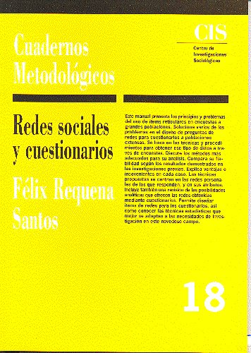 Este manual presenta los principios y problemas del uso de ítems reticulares en encuestas a grandes poblaciones. Soluciona varios de los problemas en el diseño de preguntas de redes para cuestionarios a poblaciones extensas. Se basa en las técnicas y procedimientos para obtener ese tipo de datos a través de encuestas. Discute los métodos más adecuados para su análisis. Compara su fiabilidad según los resultados demostrados en las investigaciones previas. Explica ventajas e inconvenientes en cada caso. Las técnicas propuestas se centran en las redes personales de los que responden, y en sus atributos. Incluye también una revisión de las posibilidades analíticas que ofrecen las redes obtenidas mediante cuestionarios. Permite diseñar ítems de redes para los cuestionarios, así como conocer las técnicas estadísticas que mejor se adaptan a las necesidades de investigación en este novedoso campo.